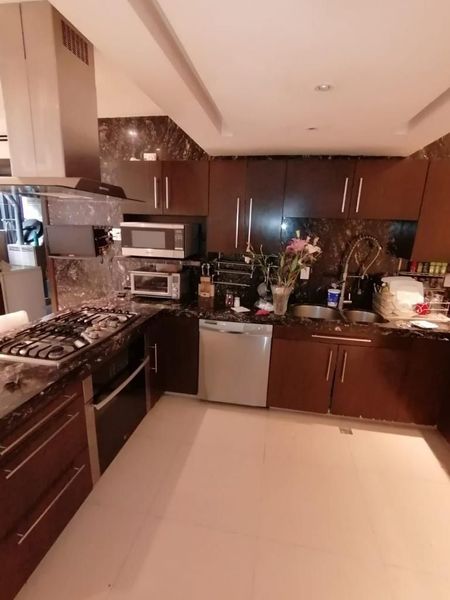 El departamento cuenta con tres habitaciones cada una con baño completo y vestidor, sala, comedor, cocina integral, baño de visitas, área de servicio, cuarto de servicio.